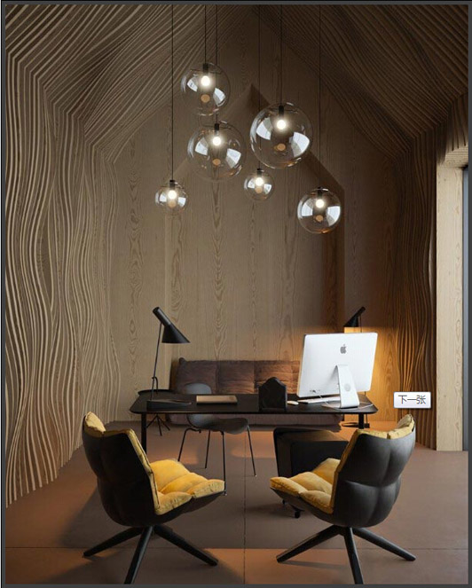 設計師把這里的吊燈用透明泡泡的玻璃罩來裝飾它的外表,此次辦公室裝修設計用了邊角料的來美化室內的辦公環境,藝術魅力很強烈的辦公室裝修設計是有很強烈的感染力的作品,這是一個開放式的空間設計手法,增強了藝術的氣氛。